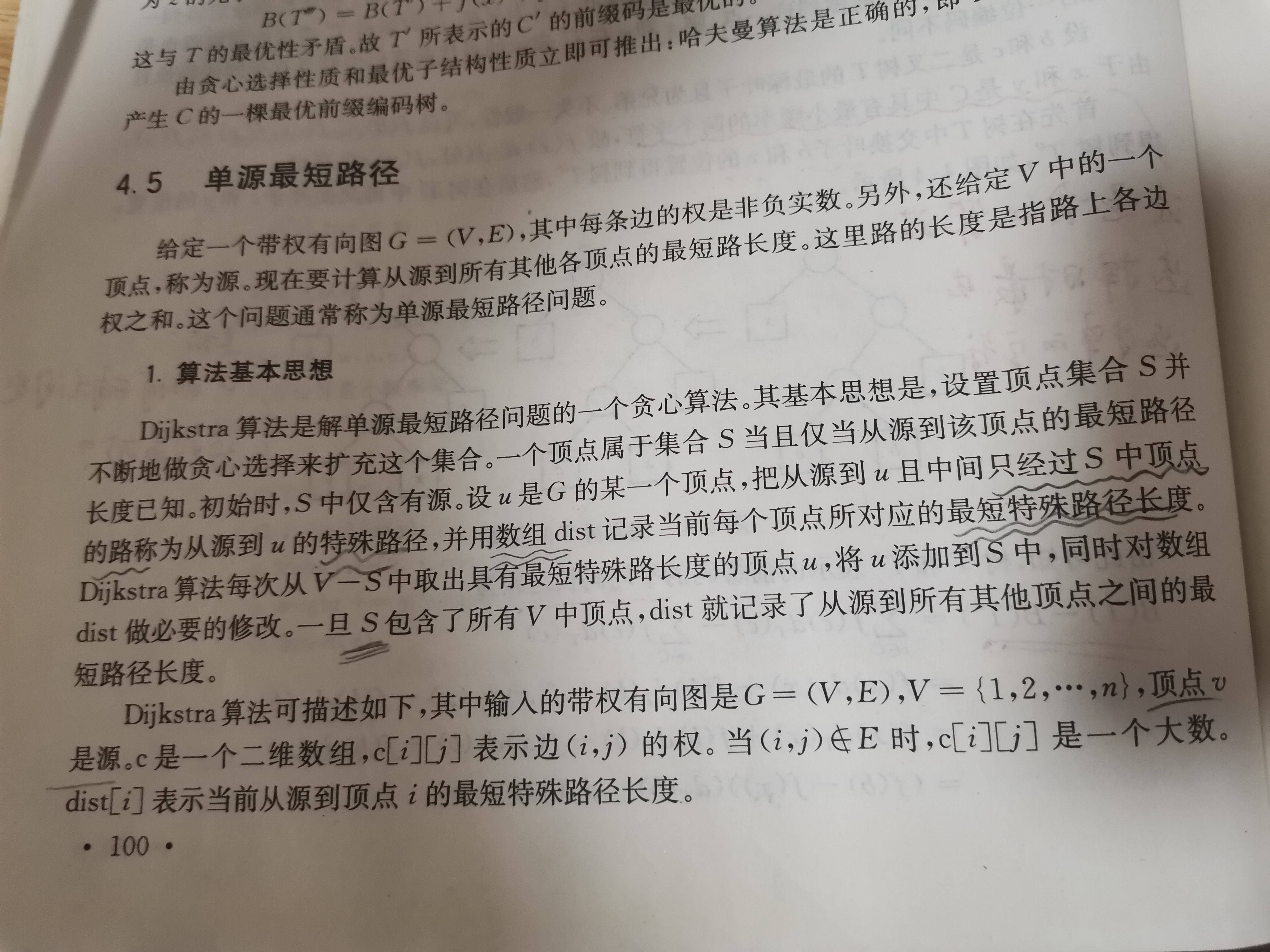 对于Dijkstra's algorithm,它的“strategies for selecting which node to expand next”是采用的greedy策略,即每次选择最小的distance,显然这是典型的greedy思想,显然只能够保证在不断的greedy选择下,最终能够得到从source到所有的其他节点的最短距离