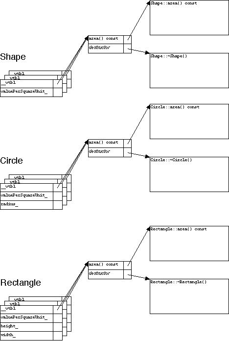 How does all this run time magic happen? The usual implementation is, every class with any virtual functions has an array of function pointers, called a "vtbl". Every instance of such as class has a pointer to its class's vtbl, as depicted below.