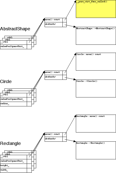 gcc 3.x and Digital Mars C/C++ compiler 8.42n rejected these programs, complaining, respectively, "abstract virtual `virtual double AbstractShape::area() const' called from constructor" (or "from destructor") and "Error: 'AbstractShape::area' is a pure virtual function".