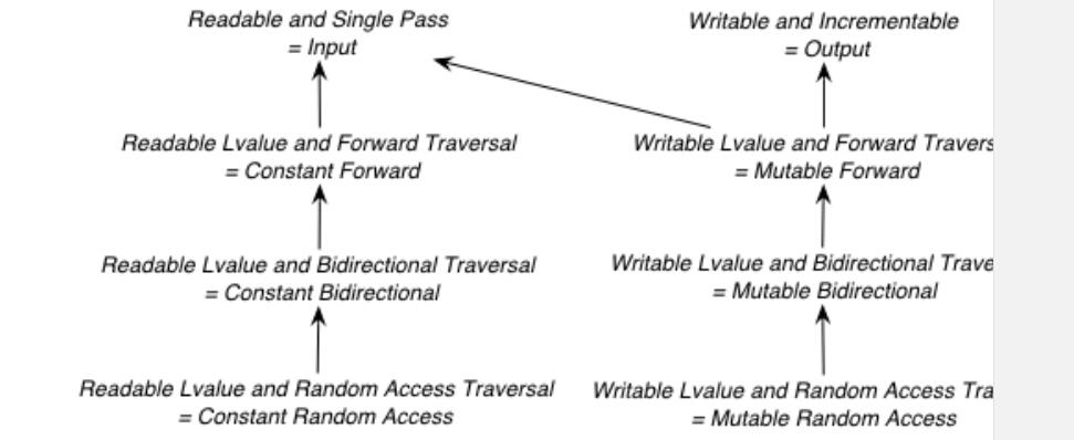As a result, many algorithms with requirements expressed in terms of the iterator categories are too strict. Also, many real-world iterators can not be accurately categorized. A proxy-based iterator with random-access traversal, for example, may only legally have a category of “input iterator”, so generic algorithms are unable to take advantage of its random-access capabilities. The current iterator concept hierarchy is geared towards iterator traversal (hence the category names), while requirements that address value access sneak in at various places. The following table gives a summary of the current value access requirements in the iterator categories.