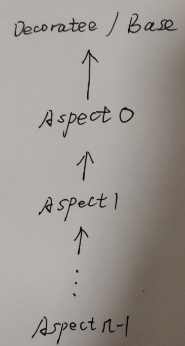 对于aspect list,即AspectsCombination,其实它只需要一个template argument: decoratee,aspect list中的第一个aspect继承自它,aspect list中的其他aspect都继承自它的前一个aspect,如下图所示: