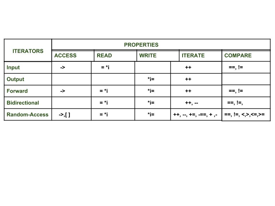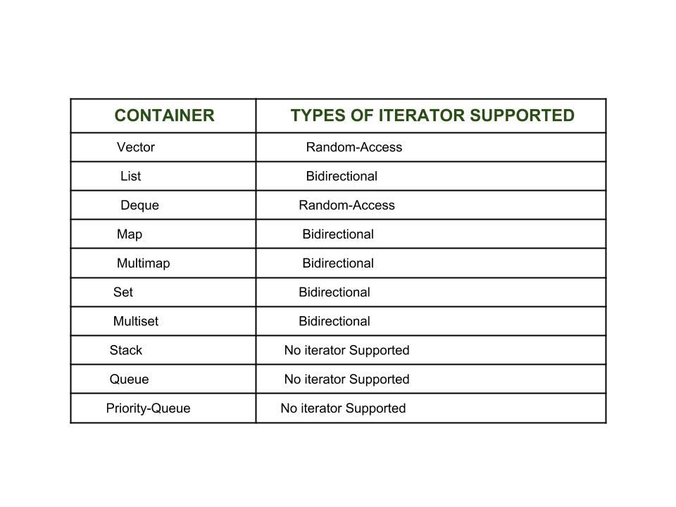 Now each one of these iterators are not supported by all the containers in STL, different containers support different iterators, like vectors support Random-access iterators, while lists support bidirectional iterators. The whole list is as given below: